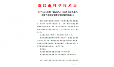 2023年12月19日,英国上市公司官网365获得了2023年第二批南昌市工程技术研究中心和重点实验室组建名单公示...